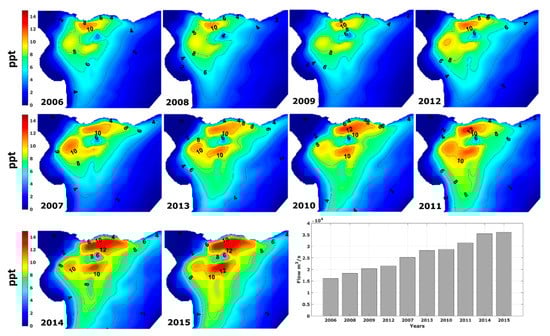Annual average salinity stratification (ppt) obtained with the model for the period 2006–2015, ordered according to increasing annual mean river flow (right corner panel). All maps are in geographic coordinates between Lat (−36.9, −34.7) and Long (−57.4, 54.2).