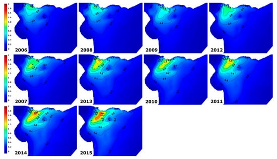Considering the period between 2006 and 2015, the annual mean fluvial flow from the combined Uruguay and Paraná rivers showed high variability, ranging from 16,000 m3/s (in 2006) to 36,000 m3/s (in 2015) (Figure 3). The spatial variation of the annual mean stratification calculated with the numerical model for this period is presented in Figure 3; in order to analyse its tendency, the results are ordered according to increasing annual mean flow. The results indicate that the highest stratification was observed in the deeper zones of the external Río de la Plata (Canal Oriental and Canal Marítimo). The shallow areas of this zone—the Arquimedes and Inglés banks and Bahia de Samborombón—presented low mean stratification values.