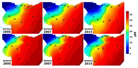 In Figure 5, the annually averaged salinity fields at the bottom and surface for the years with the highest, middle, and lowest annual mean river flow (2006, 2007, and 2015, respectively) are presented. Focusing on the bottom fields, the 2006 and 2007 are very similar, with the isohaline of 30 ppt being situated around the exterior limit of the Río de la Plata, while for 2015 there were values of 25 ppt around the same limit. When we focus on the surface fields, the differences between the three years were more noticeable, which is clearly reflected in the isohalines in Bahia de Samborombón, or along the Uruguayan coast between Montevideo and Punta del Este, generating variation in the stratification fields. The results clearly show that high annual average fluvial flow generates the extent of the freshwater area, with a higher longitudinal salinity gradient and the change in the location of the salinity front towards the ocean.