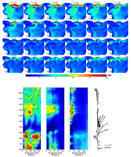 There is not much information about the salinity distribution in the Río de la Plata. The information available indicates that it is an estuary that can be characterised as a salt-wedge, partially mixed, or even well-mixed estuary, depending on the temporal scale or the location inside the estuary. There have been some studies assessing the salinity dynamics of the Río de la Plata based on field measurements. Guerrero et al. [] concluded, from an analysis of survey data from several years, that the salt wedge is a quasi-permanent feature at the Río de la Plata. This vertical structure can be destroyed by moderate-to-strong winds []. Framiñan et al. [] presented 1-day measurements of vertical currents and density over a 10-km transect at the salinity front, analysing the tidal variations. They observed that, during peak flood, the upper layer flow reversed from its predominant downstream direction, and the upstream flow occupied the entire water column; throughout the rest of the cycle, a two-layer estuarine circulation dominated. Changes in the density field were observed in response to tidal straining, tidal advection, and wind-induced mixing, while stratification remained throughout the tidal cycle. From observations of subtidal and tidal flows in the Río de la Plata, Sepúlveda et al. [] found that the southern sector is characterised by gravitational circulation due to strong tidal currents, while the northern sector is influenced by wind force due to the weak tidal currents and, in the absence of winds, the subtidal flow may be associated with a salt wedge. Simionato et al. [] studied the vertical structure of current measurements and concluded that stratification is the natural pattern in the Río de la Plata, as a consequence of the intense fluvial discharge, but also due to the prevailing winds, while stratification can only be destroyed by persistent and intense southeasterly winds (which are not frequent).