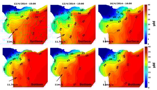 Bottom (upper panels) and surface (lower panels) salinity fields (ppt) for the southwest storm (April 2014) before the storm (left panels), a few hours after the peak of the storm (central panels), and two days after the storm (right panels). All maps are in geographic coordinates between Lat (−36.9, −34.7) and Long (−57.4, 54.2).