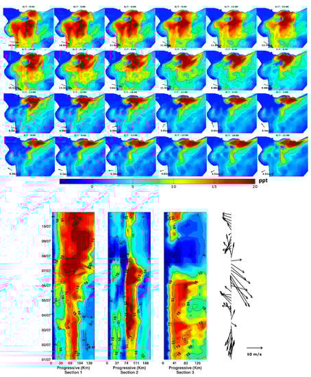 Stratification for a storm with main wind direction from the northwest, which occurred in July 2014. Upper panel: temporal evolution of the stratification field (ppt; time step: 3 h). Time increasing from left to right and upper to lower panels. All maps are in geographic coordinates between Lat (−36.9, −34.7) and Long (−57.4, 54.2). Lower panel: Hovmoller diagram along longitudinal sections (Figure 7); wind evolution on the right. Y-axis shows the date (dd/mm).