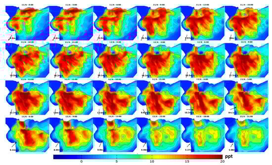 Stratification for a storm with main wind direction from the southwest, which occurred in April 2014. Upper panel: temporal evolution of the stratification field (ppt; time step: 3 h). Time increasing from left to right and upper to lower panels. All maps are in geographic coordinates between Lat (−36.9, −34.7) and Long (−57.4, 54.2). Lower panel: Hovmoller diagram along longitudinal sections (Figure 7); wind evolution on the right. Y-axis shows the date (dd/mm).