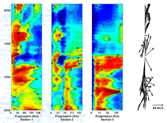 The spatiotemporal variability at storm scale was analysed by considering the salinity and stratification field before, during, and after storms with different main wind directions. In this study, we use the term storm when the wind intensity (obtained from the ECMWF reanalysis) was over 13 m/s at the OB location (see Figure 1). This condition is observed about 5–10 times a year. The storms of two particular years with fluvial discharges (one year with a relatively low annual mean fluvial flow, and another year with a relatively high annual mean fluvial flow) were analysed, in order to identify the existence of common flow and stratification patterns.