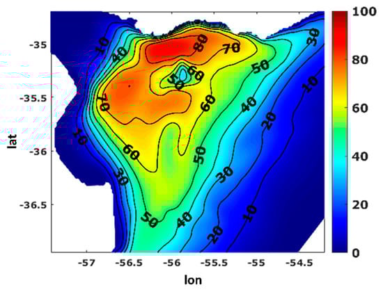Frequency (percentage) associated with vertical salinity stratification higher than 5 ppt for the Río de la Plata obtained from hourly RPtide results for the period 2005–2015.