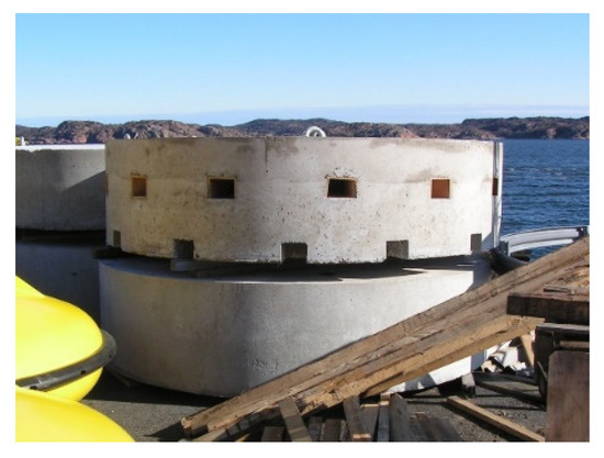 A heaving point-absorber wave power generator was developed by Uppsala University [48]. The first full-scale generator was deployed in 2006 at the Lysekil research site, followed by further deployments in the following years [48]. Throughout this study, wave power generators were neither connected to wave buoys nor was electricity generated, and thus, the park can be referred to as resting. In 2007, 21 concrete cylinders of 1 m height, 3 m diameter, and with a weight of 10 tons each (hereafter referred to as “ecological foundations”) were deployed in the Lysekil research site (Figure 2). Ecological foundations were used to simulate foundations of wave generators and to conduct studies on their environmental and ecological impact. Fishing and other activities have been undesired in the research area since 2006, yet violations to that occurred throughout all study years (personal observation). However, recreational cage fishing for decapods and boat traffic takes place in the area around the park.