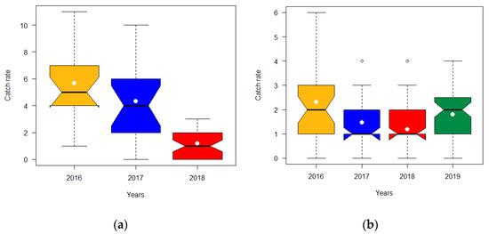 Mean catch rate (white dot), i.e., number of decapods caught in a 24 h deployment period, with 25 and 75% quartiles (lower and upper box margin, respectively) and 95% confidence interval (whisker), median (thick black bar), notch (95% confidence interval of the median), and possible outliers (open dots) among the different survey years for (a) small and (b) large cages.