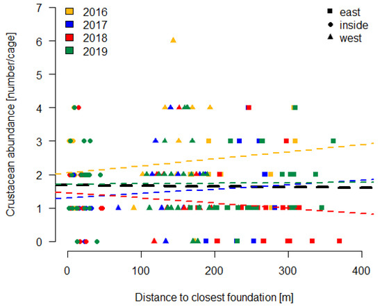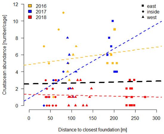 The mean number of decapods per cage, including all years and sampling sites, was 2.7 individuals and the range of caught decapods per cage was 1–11 (Figure 5). When the data of different years were pooled, the number of decapods caught with small cages increased with distance to the ecological foundations, on average, by 0.1 individuals every 100 m (linear model: abundance = 0.001 × Distance (D) + 2.57 (Figure 5)), indicating a statistically non-significant relationship between decapod abundance and distance to the ecological foundations (F (1,88) = 0.007, p = 0.79). Variation in decapod abundance was large and is also reflected by a low level of explained data variance (r2 = 0.08%) by the model.