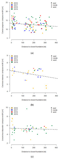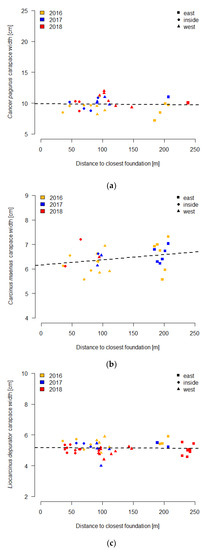 Cancer pagurus, Carcinus maenas, and Liocarcinus depurator caught with the small and large cages indicated a non-significant relationship between carapace width and distance to the ecological foundations (Figure 7a–c and Figure 8b,c and Table 4), with one exception of Cancer pagurus caught with the large cages (Figure 8a and Table 4). The carapace width of Cancer pagurus decreased, on average, by 0.45 cm every 100 m (linear model: abundance = −0.0045 × D + 13.33) (Figure 8a), indicating a significant relationship between brown crab carapace width and distance to the ecological foundations in 2017 (F (1,115) = 4.47, p = 0.037).