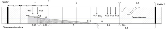 The physical tests were carried out in the Atmosphere-Ocean Interaction Flume (CIAO) of the Andalusian Institute for Earth System Research (IISTA)-University of Granada (Figure 1a). This wave flume is dedicated to the combined study of marine and atmospheric processes. The facility is equipped with two opposed piston-type generating paddles, with an active system to absorb reflection, and a closed circuit for wind generation. The wave flume has a width of 1 m, length of 16 m, and a range of generating waves of periods from 1 to 5 s and wave heights up to 25 cm (see Figure 1 and Figure 2).