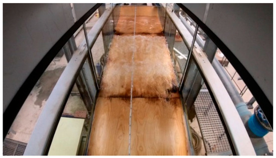 Wave run-up was obtained by analysing video images from inside the wave flume, and from outside (Figure 3). For this purpose, tape measures were placed both on the side of the flume and along the slope (Figure 1b and Figure 3), which allowed, in the subsequent viewing of the videos, the evaluation of the maximum run-up reached by the waves. The accuracy of the measurement is that corresponding to the discretisation of the tape measure, 0.01 m.
