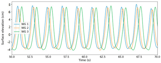 Surface elevation measured in the first three wave gauges (WG1, WG2, and WG3) in the test with target waves of H = 0.116 m and T = 2.04 s.