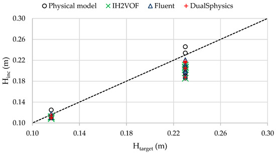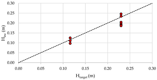 The proper behaviour of wave generation can be evaluated comparing target wave height, Htarget, versus the incident wave height, Hinc, obtained by applying the Baquerizo Method ([38], based on [39]), to separate incident and reflected wave based on the measured time series of surface elevation on the three wave gauges (Figure 5).