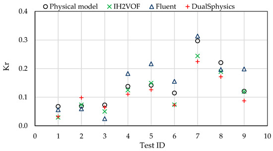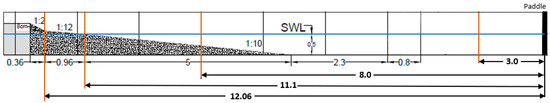 For DualSPHysics, the sensitivity analysis was performed by changing the initial inter-particle distance, dp. In this analysis, seven different resolutions were used, with initial inter-particle distance ranging from 1 mm to 20 mm. An active wave absorption system (AWAS) was used to absorb the reflected waves at the piston [31]. Waves were generated following Stokes II and using a piston-type wave-maker. The initial inter-particle distance, total number of particles, and number of particles per wave height are presented in Table 9.