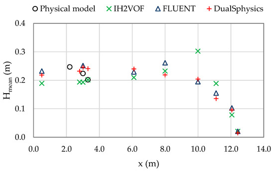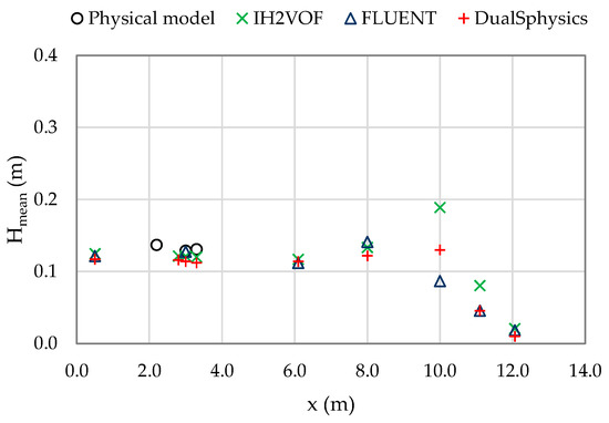 For the overtopping case, Table 11 presents the mean wave height at four gauges located at x = 3.0 and 10.0 m, before the wave breaking, x = 12.06 m, at the toe of the dike, and 12.42 m, at the top of the dike, and the mean wave overtopping discharge.