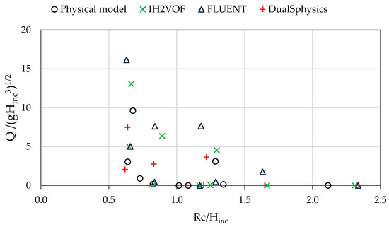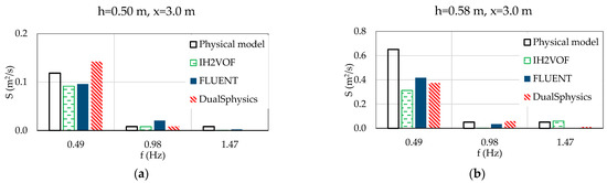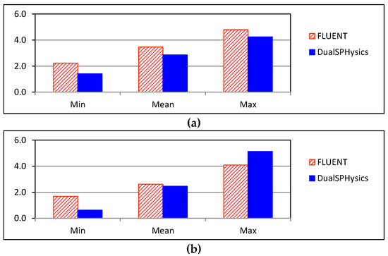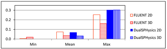 Some discrepancies can be observed between FLUENT and DualSPHysics results for 2D and 3D simulations, featuring a much smaller difference of mean wave overtopping discharge in 2D and 3D. Due to the numerical diffusion and viscous dissipation effects of SPH method in solving small water sheet, in some wave periods, DualSPHysics does not present any wave overtopping discharge in 2D and 3D (Figure 20). Nevertheless, the minimum wave overtopping discharge obtain by FLUENT in 2D was very small, only 0.004 m3/s/m, which is not the case in 3D, since FLUENT shows a minimum wave overtopping discharge of 0.020 m3/s/m. For mean wave overtopping discharge, a similar value was obtained by FLUENT and DualSPHysics in 2D, 0.074 and 0.068 m3/s/m, respectively, and maximum wave overtopping discharge exhibits the same order of magnitude. For 3D simulation, similar mean wave overtopping discharge was also obtained by FLUENT and DualSPHysics, 0.036 and 0.033 m3/s/m, respectively, but maximum wave overtopping discharge for FLUENT is half that of DualSPHysics.