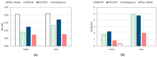 Minimum, mean, and maximum (a) wave overtopping discharge (m3/s/m) and (b) water flow height (m) at the crest of the groin head for FLUENT and DualSPHysics.