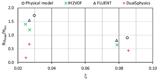 For a regular wave target height and period for the same water depth, wave height normalised RMSE of 15% was found. These differences are related to wave generation (experimental and numerical) and to the turbulence models used in the numerical models. Differences in the way the models account for the free surface—the VoF method for FLUENT and IH2VOF and only the water flow for DualSPHysics—lead to differences in breaking position and dissipation. Consequently, differences in run-up, from 94% to DualSPHysics to 21% to FLUENT, and on mean wave overtopping discharge, from 146% to FLUENT (for smaller mean wave overtopping discharge) to 16% to DualSPHysics, were found when compared with the physical model results. A normalised RMSE between 37% and 44% was obtained for maximum run-up and between 51% and 405% for mean wave overtopping discharge. The complexity of the case tested, i.e., plunging wave with intense turbulent flow and a chaotic mixture flow interacting with a dike, highlights the sensibility and limitations of the numerical models for this kind of applications.