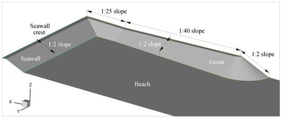 In FLUENT, a non-conform mesh is constructed based on hexaedrics control volumes. This approach allows a better optimisation of mesh refinement and a control of the number of control volumes. The mesh refinement criterion respects the results of the sensitive analysis performed in Section 4 at model scale 1:34.5, allowing a good representation of wave propagation, wave breaking, and overtopping in 3D. Far from the groin, the mesh is slightly stretched considering that, in 3D, principal phenomena occur in wave propagation direction.