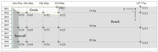 Free surface gauges inside the wave tank (G11 to G54) and overtopping gauges on the crest head groin (C01) and the crest breakwater (B01 to B10).