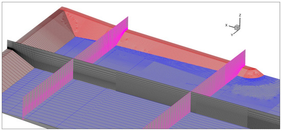 Figure 19 shows the mesh resolution in several planes the free surface at rest and on the dike and groin structures. The vertical (z direction) resolution in the proximity of the structure is defined as follows. Control volumes with 0.07 m height are used at the dike and groin crest; control volume with 0.28 m height is used at the dike toe and varying from 0.28 m to 0.07 m along the dike slope; control volume height varies along the toe of the groin from 0.28 m, near the dike, to 0.40 m, near the head groin. The horizontal resolution is defined as follows. Control volumes wide along the dike crest, in the y direction, is 0.28 m near the junction between the dike and the groin increasing to 2.0 m near the symmetric plan; control volume length along the groin, in the x direction, is 0.28 m near the junction between the dike and the groin and increases to 0.40 m near the head groin. Mesh resolution in the x direction inside the wave tank is defined by the criterion established in Section 3 for wave propagation, beach, wave breaking, and breakwater zones. Mesh resolution in transversal direction y varies from 0.28 to 2.0 m in the zone between the groins. Mesh refinement in vertical direction in the vicinity of free surface is around 20 control volumes of 0.4 m height between wave through and the crest which is enough in wave propagation zone. Near the dike and the groin, mesh resolution in vertical direction around the free surface is between 0.28 and 0.4 m. The total number of control volumes is 1,454,953.