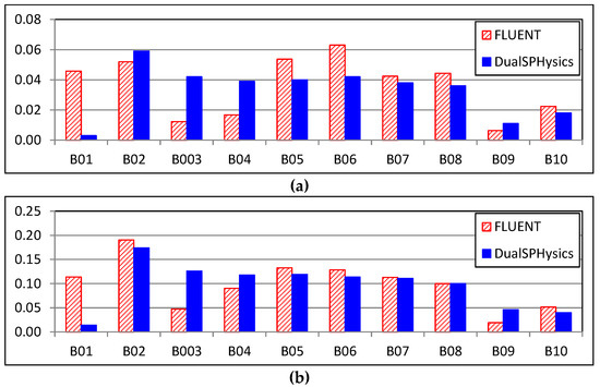 Mean (a) and maximum (b) wave overtopping discharge (m3/s/m) along the dike at gauges B01 to B10 for FLUENT and DualSPHysics.