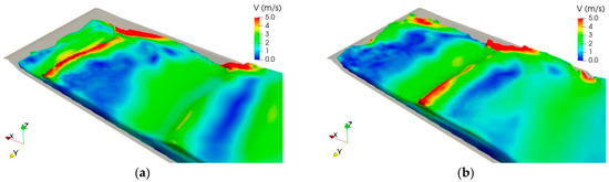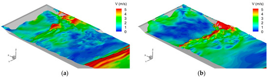Free surface obtained with DualSPHysics for the moment when: (a) wave run-down the dike; (b) wave overtops the groin (free surface is coloured by velocity magnitude).