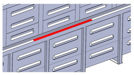 It was taken that the grab mass was 1800 kg [33]. In order to simulate the impact interaction of the grab bucket with the upper strapping of the gondola car supporting structure, a pad was installed on it, the geometric parameters of which are equal to the area of contact with the grab bucket (Figure 7). Shock was applied to this pad using SolidWorks Simulation software options.
