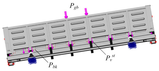 When creating the design scheme, it was taken into account that the body of the gondola car is subject to a vertical static load due to the weight of the load Pvst, the pressure of the expansion of the bulk cargo Pbk, as well as the load from the grab bucket Pgb (Figure 8). At the same time, the blow was considered as absolutely hard. The leaning of the body on the bogies was modelled by placing elastic ties on the centre plates. In this case, the stiffness of the springs is 8000 kN/m, i.e., corresponding to the stiffness of the bogie spring sets 18–100.