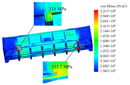The maximum equivalent stresses in the bearing structure of an open car amounted to about 320 MPa, which is 32% lower than in the standard design. The maximum displacements were about 20 mm. Thus, the strength of the improved bearing structure of an open car body was provided. It should be noted that the maximum equivalent stresses in the bearing structure were reduced three times in comparison to those of the typical structure.
