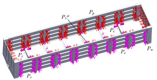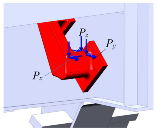 The design diagram of an open car body during sea disturbance (the highest loads on the bearing structure of a car) included the following forces (Figure 11): vertical static force, Pvst; wind force, Pw; lateral pressure from the freight, Pp and force on the body through chain binders, Pc. Due to the spatial layout of a chain binder, the force through it to the bearing structure of an open car body was decomposed (Figure 12).