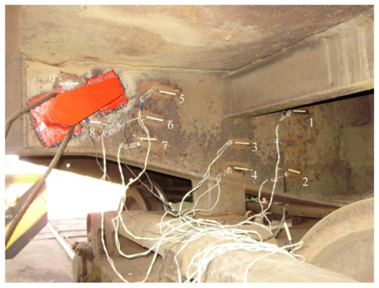 The strain gages were arranged as a Wheatstone bridge. A compensating strain gage was mounted on the homogeneous non-deflecting plate (09Mn2Cu) of a car body (Figure 17). The strain gages were connected in the electric diagram with the 0.5 mm2 wires.