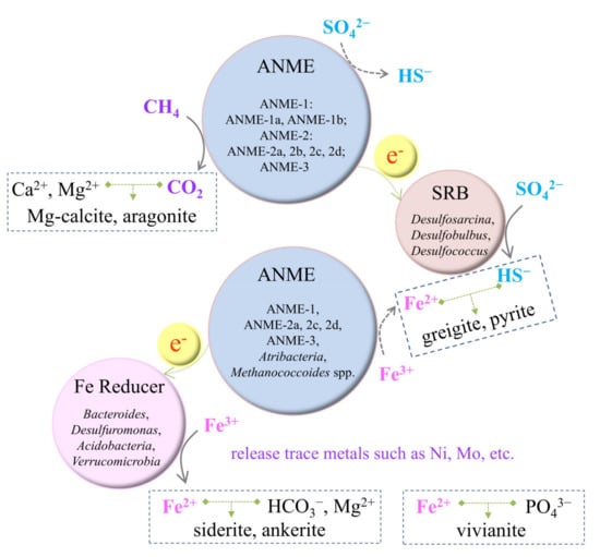The transformation between Fe(II)/Fe(III) plays a critical part in the geochemical iron cycle and the mineralization of organic substances (Figure 2). Various iron minerals such as pyrite, vivianite, siderite, and magnetite could be produced by the reaction of ferrous iron with carbonate, sulfide, phosphate, and residual Fe(III) [,,]. Especially in seawater of the ancient Earth, rich in methane and ferrous iron, Fe-AOM may have potent influences on its composition [,]. Maerz et al. suggested that in Zambezi deep-sea fan sediments, Fe(II) phosphate vivianite is favorably produced []. Lim et al. observed a marked pyrite signature induced by AOM near the sulfate–methane interface [].