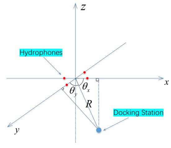 In Figure 2, four red points represent four hydrophones, the blue point stands for the position of DS. and are the relative pose vector with reference to the x-axis and -axis, respectively. The coordinate of AUV relative to the DS can be represented by which has the following relation: