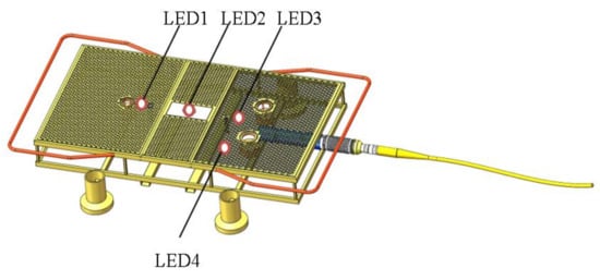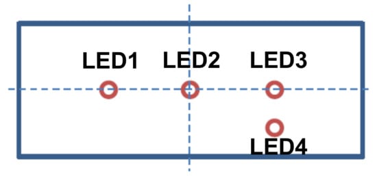 Design of the LED light array on the DS. The three LEDs are arranged on the same line which is the longitudinal axis of the DS. There is one LED namely LED2 located at the center of the DS with its left LED 1 and right LED3 symmetrically installed. The fourth light, LED4 is on the same side as LED3, whose connecting line is perpendicular to the longitudinal axis of DS. According to the configuration of the DS shown in Figure 3, the longitudinal axis of DS passes through the connecting line between the two charging pile centers on the right side and the center of the charging pile on the left side. As shown in Figure 3, the LED light array is designed in detail as follows: 1. LED2 is located at the center of the DS. LED1, LED2, and LED3 are arranged on the longitudinal axis of the DS. The central location and the longitudinal axis of the DS can be determined by the location of three LEDs captured in the image; 2. LED1, LED2, and LED3 consist of one axis while LED3 and LED4 make the other axis. Hence, the asymmetry makes it convenient to distinguish the axis and the heading angle of the AUV by the number of lights when the image is rotated;