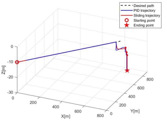 Figure 10 shows the space navigation trajectory of the whole process of AUV homing and docking. From the figure, it can be seen that AUV can stably track the target line and target point through different controller methods: sliding mode controller and PID controller.