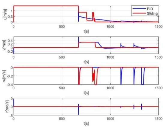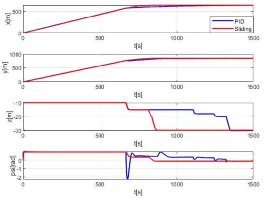 Figure 11 and Figure 12 show the specific change process of AUV’s position, attitude, and speed with four degrees of freedom controlled. Compared with the tracking effect using the PID controller, the sliding mode controller does not present a significant difference at the stage of tracking the straight-line, but in the later point tracking stage, the sliding mode method can achieve faster and smoother tracking to the target endpoint. By using the sliding mode control method, AUV can reach the endpoint at 900 s which is taking much less time than 1400 s by PID controller. The sliding mode method can also achieve a much more smooth tracking effect in the process of switching from tracking target line to tracking target points and tracking between different target points, and finally, reach the end position with the expected heading angle more accurately. At the end of 1500 s ‘simulations, AUV controlled by the sliding mode method can achieve X-direction error less than 0.01 m, Y-direction error less than 0.01 m, Z-direction error less than 0.01 m, and heading angle psi error less than 0.1°. However, in the PID controller simulations, the x-direction error of AUV is less than 1 m, the y-direction error is less than 1.5 m, the z-direction error is less than 0.3 m, and the heading angle psi error is less than 0.5°. Although the simulation time continues to increase, the tracking error of the control method may be further reduced, but more control time is obviously not desirable in practical application.