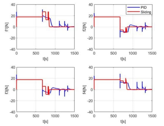 Figure 13 shows the change process of the expected control quantity of four degrees of freedom. It can be clearly seen that the jump of the control force is caused by the sudden change of tracking error during the switching between target lines to points. However, the final control force is 0 stable at the end position. Compared with PID controller simulation tests, the output torque of yaw freedom of the sliding mode method is significantly lower, resulting in more effective heading control. Figure 14 shows the thrust change process of four thrusters in the horizontal plane. The four thrusters distribute the three degrees of freedom control quantities in the horizontal plane. After the final stability, the thruster output is 0.