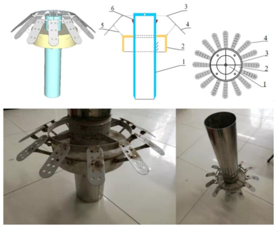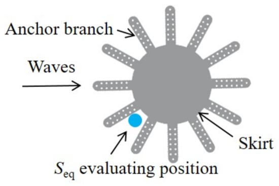 The rapid expansion of cities tends to cause social and economic problems, such as environmental pollution and traffic jam. As a kind of clean energy, offshore wind power has developed rapidly in recent years. The foundation of offshore wind turbine (OWT) supports the upper tower, and suffers the cyclic loading induced by waves, tides and winds, which exerts a vital influence on the OWT system. The types of OWT foundation include the fixed and floating foundation, and the fixed foundation was used usually for nearshore wind turbine. After the construction of fixed foundation, the hydrodynamic field changes in the vicinity of the foundation, leading to the horseshoe vortex formation and streamline compression at the upside and sides of foundation respectively [,,,]. As a result, the neighboring soil would be carried away by the shear stress induced by vortex, and the scour hole would emerge in the vicinity of foundation. The scour holes increase the cantilever length, and weaken the lateral bearing capacity of foundation [,,,,]. Moreover, the natural frequency of OWT system increases with the increase of cantilever length, causing the resonance occurs when the system natural frequency equals the wave or wind frequency [,,]. Given that, an innovative foundation called umbrella suction anchor foundation (USAF) has been designed for nearshore wind power. The previous studies indicated the USAF was characterized by the favorable lateral bearing capacity with the low cost [,,]. The close-up of USAF is shown in Figure 1, and it includes six parts: 1-interal buckets, 2-external skirt, 3-anchor ring, 4-anchor branch, 5-supporting rod, 6-telescopic hook. The detailed description and application method of USAF can be found in reference [].