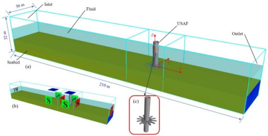 The seabed-USAF-wave three-dimensional scour numerical model was built using Flow-3D software. As shown in Figure 2, the model includes sandy seabed, USAF model, sea water, two baffles and porous media. The dimensions of USAF are shown in Table 1. The sandy bed (210 m in length, 30 m in width and 11 m in height) is made up of uniform fine sand with median diameter d50 = 0.041 cm. The USAF model includes upper steel tube with the length of 20 m, which was installed in the middle of seabed. The location of USAF is positioned at 140 m from the upstream inflow boundary and 70 m from the downstream outflow boundary. Two baffles were installed at two ends of seabed. In order to eliminate the wave reflection basically, the porous media was set at the outflow side on the seabed.