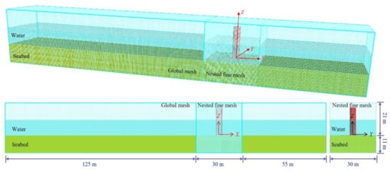 The nested mesh block was adopted for seabed in vicinity of the USAF, which was overlapped with the global mesh block. When two mesh blocks overlap each other, the governing equations are by default solved on the mesh block with smaller average cell size (i.e., higher grid resolution). It is should be noted that the Flow 3D software used the moving mesh captures the scour evolution and automatically adjusts the time step size to be as large as possible without exceeding any of the stability limits, affecting accuracy, or unduly increasing the effort required to enforce the continuity condition [].