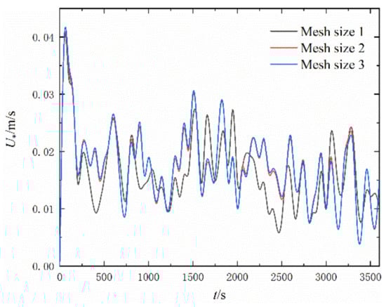 In this section, a mesh sensitivity analysis was conducted to investigate the influence of mesh grid size to results and make sure the calculation is mesh size independent and converged. Three mesh grid size were chosen: Mesh 1—global mesh grid size of 0.75 × 0.75, nested fine mesh grid size of 0.4 × 0.4, and total number of grids 1,724,000, Mesh 2—global mesh grid size of 0.6 × 0.6, nested fine mesh grid size of 0.3 × 0.3, and total number of grids 1,812,000, Mesh 3—global mesh grid size of 0.4 × 0.4, nested fine mesh grid size of 0.2 × 0.2, and total number of grids 1,932,000. The near-bed shear velocity U* is an important factor for influencing scour process [,], so U* at the position of (4,0,11.12) was evaluated under three mesh sizes. As the Figure 4 shown, the maximum error of shear velocity ∆U*1,2 is about 39.8% between the mesh 1 and mesh 2, and 4.8% between the mesh 2 and mesh 3. According to the mesh sensitivity criterion adopted by Pang et al. [], it’s reasonable to think the results are mesh size independent and converged with mesh 2. Additionally, the present model was built according to prototype size, and the mesh size used in present model is larger than the mesh size adopted by Higueira et al. [] and Corvaro et al. []. If we choose the smallest cell size, it will take too much time. For example, the simulation with Mesh3 required about 260 h by using a computer with Intel Xeon Scalable Gold 4214 CPU @24 Cores, 2.2 GHz and 64.00 GB RAM. Therefore, in this case, considering calculation accuracy and computation efficiency, the mesh 2 was chosen for all the simulation in this study.