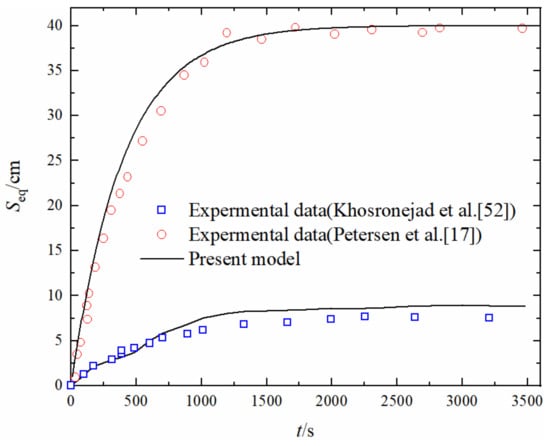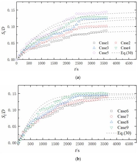 Figure 8 displays the scour evolution for case 1–9. As shown in Figure 8a, the scour depth increased rapidly at the initial stage, and then slowed down at the transition stage, which attributes to the backfilling occurred in scour holes under live bed scour condition, resulting in the net scour decreasing. Finally, the scour reached the equilibrium state when the amount of sediment backfilling equaled to that of scouring in the scour holes, i.e., the net scour transport rate was nil. Sumer and Fredsøe [] proposed the following formula for the scour development under waves