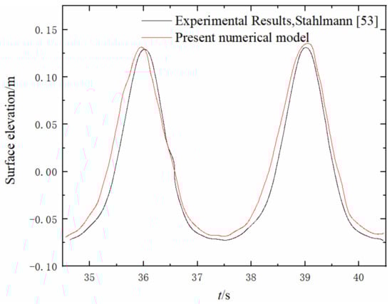 In addition, in order to calibrate and validate the present model for hydrodynamic parameters, the comparison of water surface elevation was carried out with laboratory experiments conducted by Stahlmann [] for wave gauge No. 3. The Figure 6 depicts the surface wave profiles between experiments and numerical model results. The comparison indicates that there is a good agreement between the model results and experimental values, especially the locations of wave crest and trough. Comparison of the surface elevation instructs the present model has an acceptable relative error, and the model is a calibrated in terms of the hydrodynamic parameters.