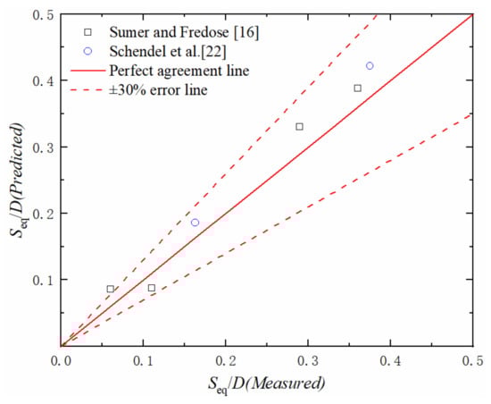 Finally, another comparison was conducted for equilibrium scour depth or maximum scour depth under random waves with the experimental data of Sumer and Fredsøe [] and Schendel et al. []. The Figure 7 shows the comparison between the numerical results and experimental data of Run01, Run05, Run21 and Run22 in Sumer and Fredsøe [] and test A05 and A09 in Schendel et al. []. As shown in Figure 7, the equilibrium scour depth or maximum scour depth distributed within the ±30 error lines basically, meaning the reliability and accuracy of present model for predicting equilibrium scour depth around foundation in random waves. However, compared with the experimental values, the present model overestimated the equilibrium scour depth generally. Given that, a calibration for scour depth was carried out by multiplying the mean reduced coefficient 0.85 in following section.