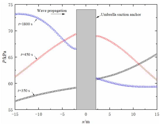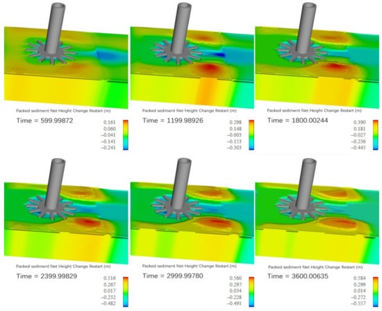 From Figure 9, at the initial stage (t < 1200 s), the scour occurred at upstream foundation edges between neighboring anchor branches. The maximum scour depth appeared at the lee-side of the USAF. Correspondingly, the sediments deposited at the periphery of the USAF, and the location of the maximum accretion depth was positioned at an angle of about 45° symmetrically with respect to the wave propagating direction in the lee-side of the USAF. After that, when t > 2400 s, the location of the maximum scour depth shifted to the upside of the USAF at an angle of about 45° with respect to the wave propagating direction.