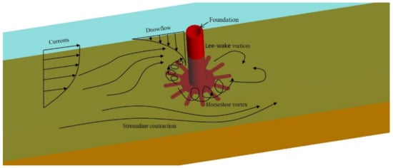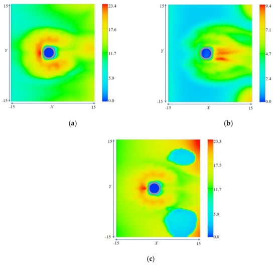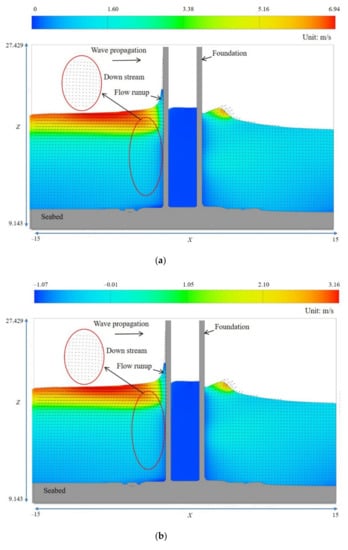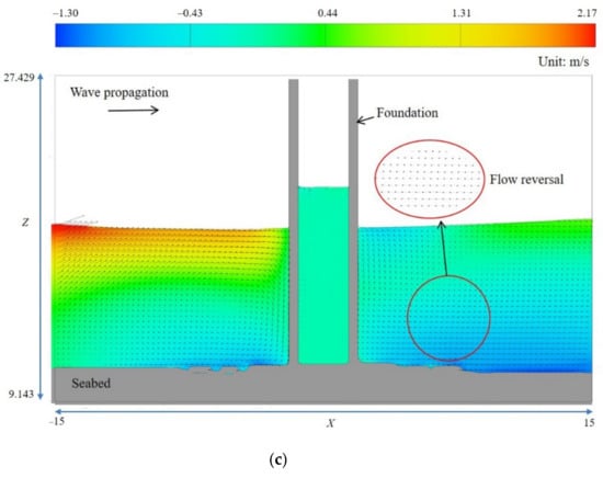 According to previous studies [,,,,,], the horseshoe vortex, streamline compression and wake vortex shedding were responsible for scour around foundation. The Figure 10 displays the distribution of flow velocity in vicinity of foundation, which reflects the evolving processes of horseshoe vertex.
