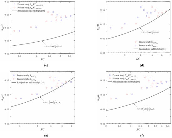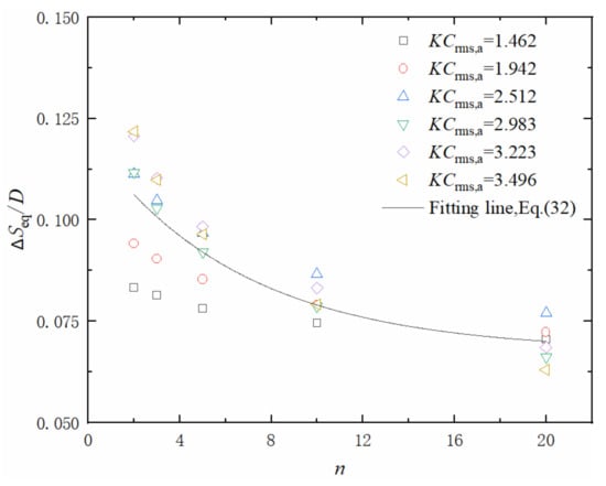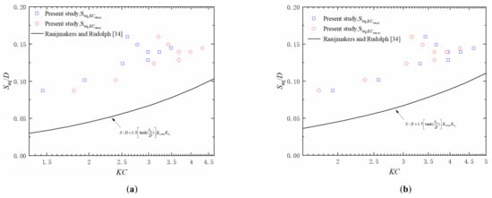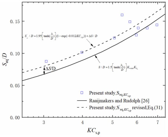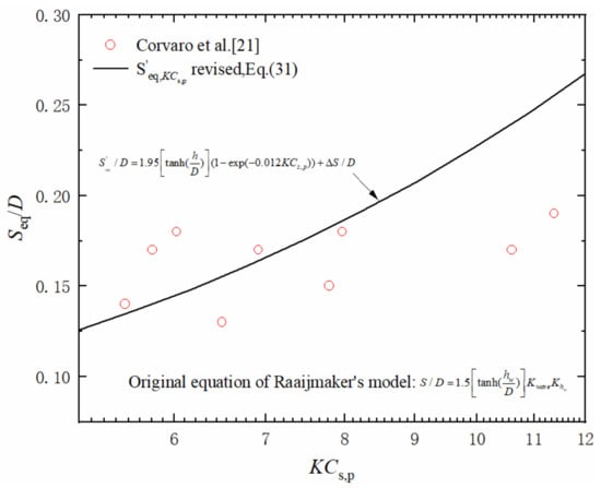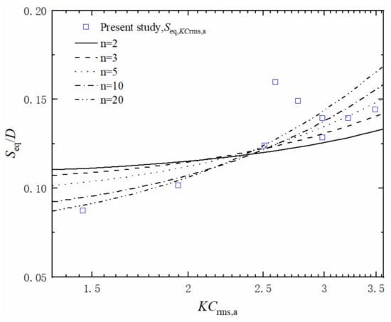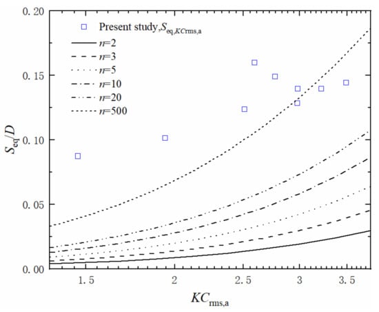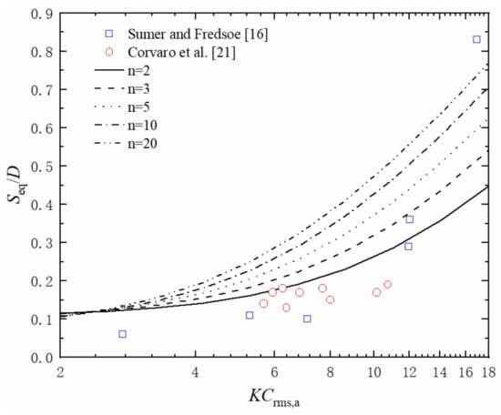 - Another further revision model (Equation (33)) was proposed according to the stochastic model established by Myrhaug and Rue [] to predict the equilibrium scour depth around USAF under random waves, and the predicting results are the most favorable for n = 10 when KCrms,a < 4. However, contrary to the case of low KCrms,a, the predicting results are the most favorable for n = 2 when KCrms,a > 4 by the comparison with experimental results of Sumer and Fredsøe [] and Corvaro et al. [].