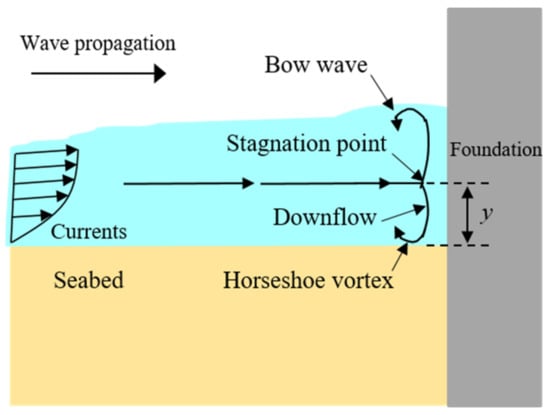 Numerical and experimental investigations of scour around OWT foundation under steady currents and waves have been extensively studied by many researchers [,,,,,,,,,,,]. The seabed scour can be classified as two types according to Shields parameter θ, i.e., clear bed scour (θ < θcr) or live bed scour (θ > θcr). Due to the set of foundation, the adverse hydraulic pressure gradient exists at upstream foundation edges, resulting in the streamline separation between boundary layer flow and seabed. The separating boundary layer ascended at upstream anchor edges and developed into the horseshoe vortex. Then, the horseshoe vortex moved downstream gradually along the periphery of the anchor, and the vortex shed off continually at the lee-side of the anchor, i.e., wake vortex. The core of wake vortex is a negative pressure center, liking a vacuum cleaner. Hence, the soil particles were swirled into the negative pressure core and carried away by wake vortexes. At the same time, the onset of scour at rear side occurred. Finally, the wake vortex became downflow when the turbulence energy could not support the survival of wake vortex. According to Tavouktsoglou et al. [], the scale of pile wall boundary layer is proportional to 1/ln(Rd) (Rd is pile Reynolds), which means the turbulence intensity induced by the flow-structure interaction would decrease with Rd increases, but the effects of Rd can be neglected only if the flow around the foundation is fully turbulent []. According to previous studies [,,,,,,,], the scour development around pile foundation under waves was significantly influenced by Shields parameter θ and KC number simultaneously (calculated by Equation (1)). Sand ripples widely existed around pile under waves in the case of live bed scour, and the scour morphology is related with θ and KC. Compared with θ, KC has a greater influence on the scour morphology [,,]. The influence mechanism of KC on the scour around the pile is reflected in two aspects: the horseshoe vortex at upstream and wake vortex shedding at downstream.
