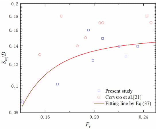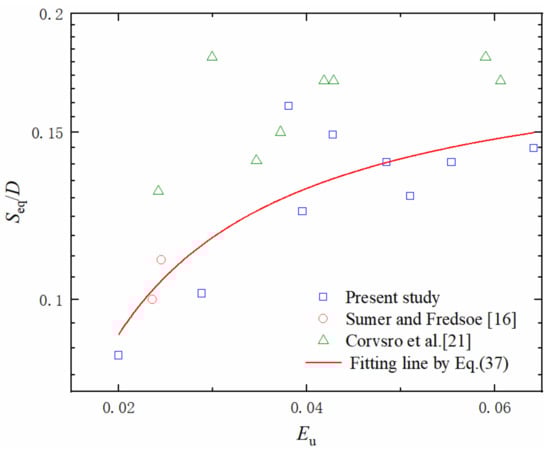 - The same formula (Equation (37)) is applicable to express the relationship of Seq/D with Eu or Fr, and it can be inferred that the higher Fr and Eu both lead to the more intensive horseshoe vortex and larger Seq.